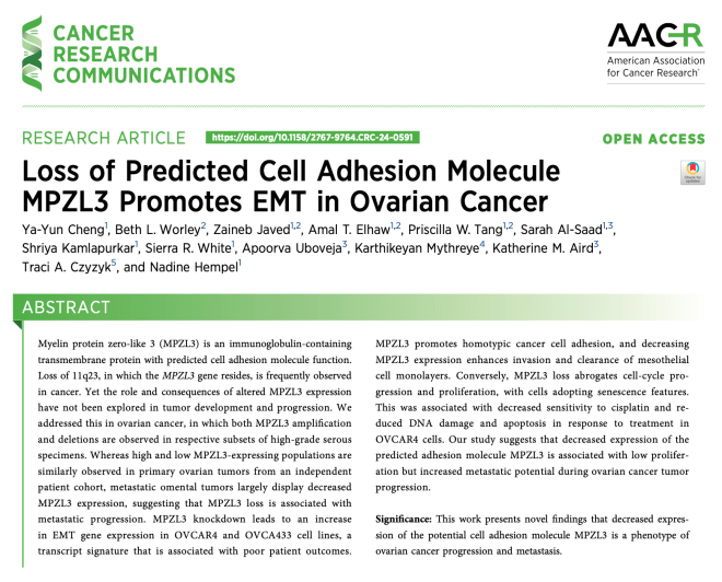 Post-doctoral fellow Dr. Ya-Yun Cheng published “Loss of Predicted Cell Adhesion Molecule MPZL3 Promotes EMT in Ovarian Cancer” in July in Cancer Research Communications. This work was started by former graduate student Dr. Beth Worley. Ya-Yun and Beth found that decreased expression of the predicted adhesion molecule MPZL3 is associated with low proliferation but increased metastatic potential in ovarian cancer cells.